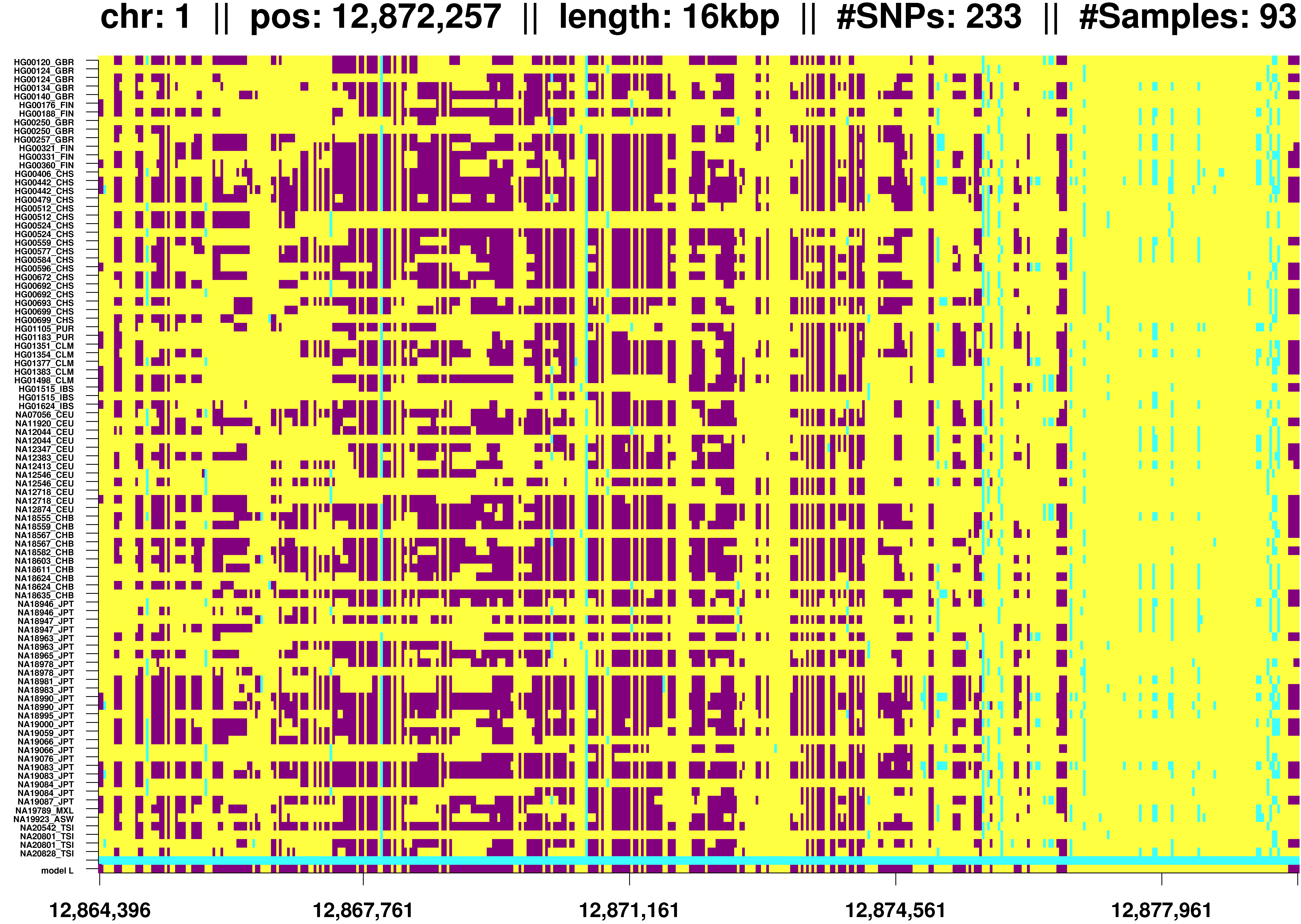 Figure 2 IBD segment observed in all populations including one African. However this might also be a region of sequencing errors because the tagSNV pattern is not very clear.