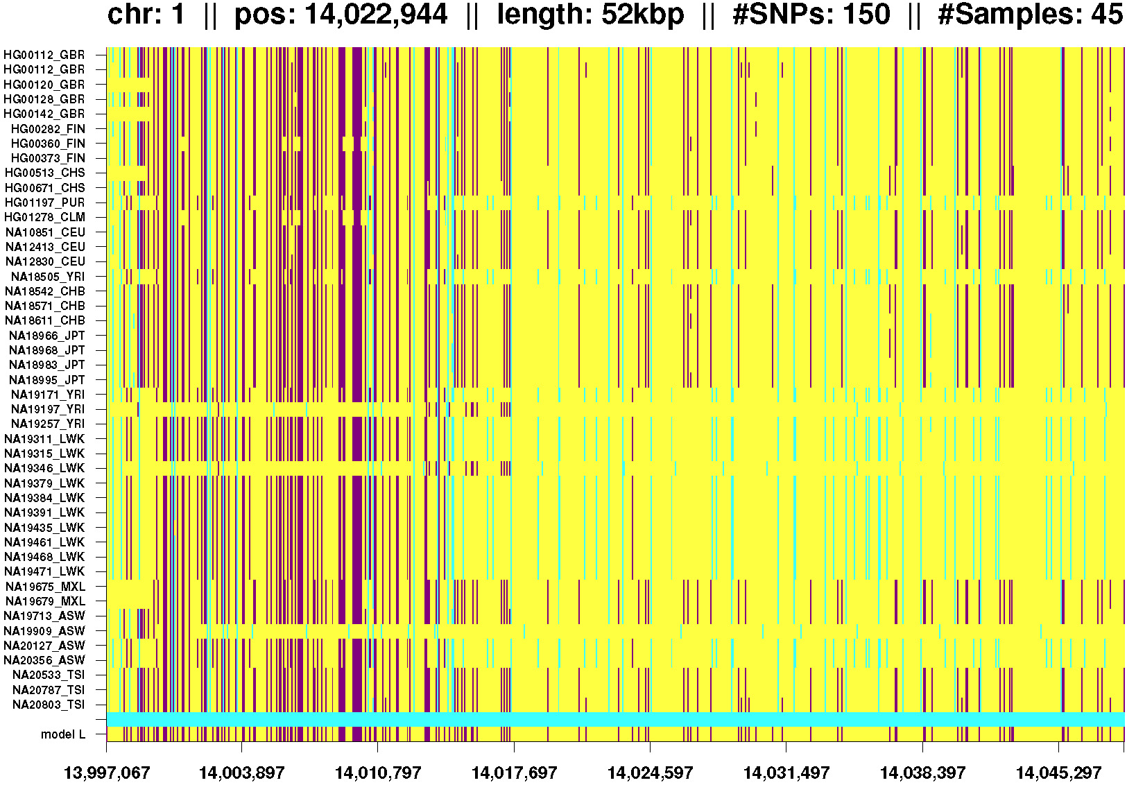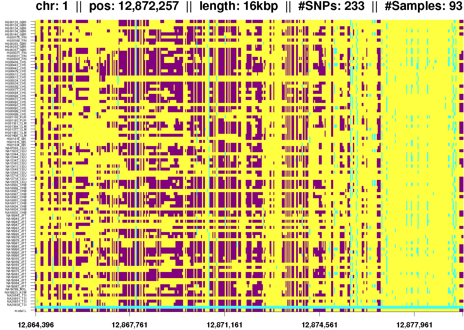 Figures 1-6: Examples of IBD segments that were extracted from chromosome 1 of the 1000 Genomes Project. For these phased genotype data, phasing errors can be seen (yellow lines from the left hand side). Click on any of these thumbnails to view full-size images.