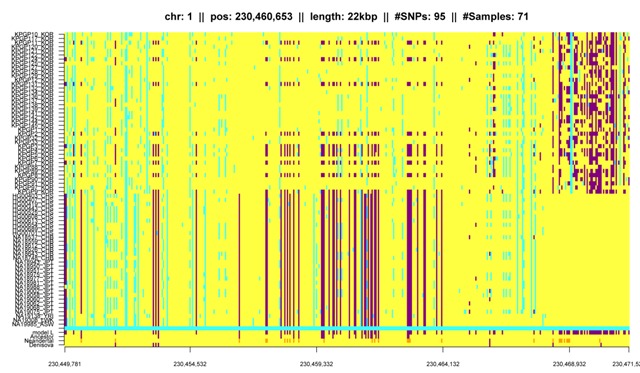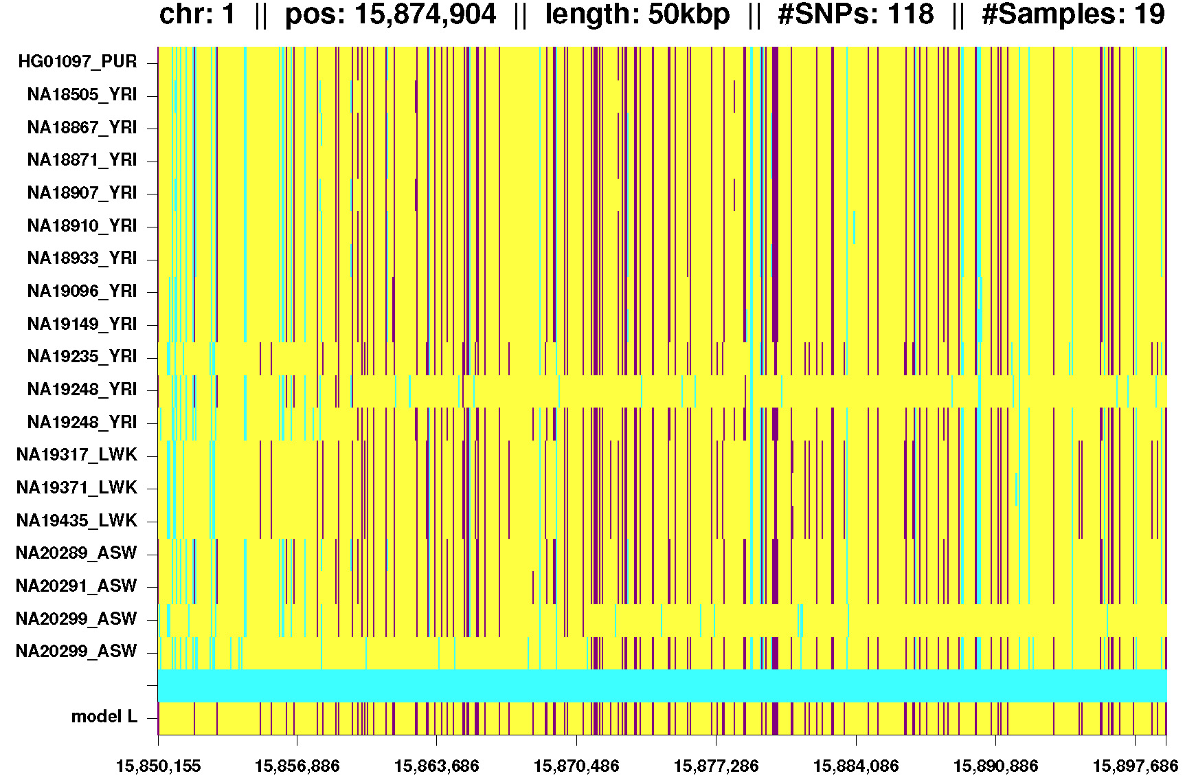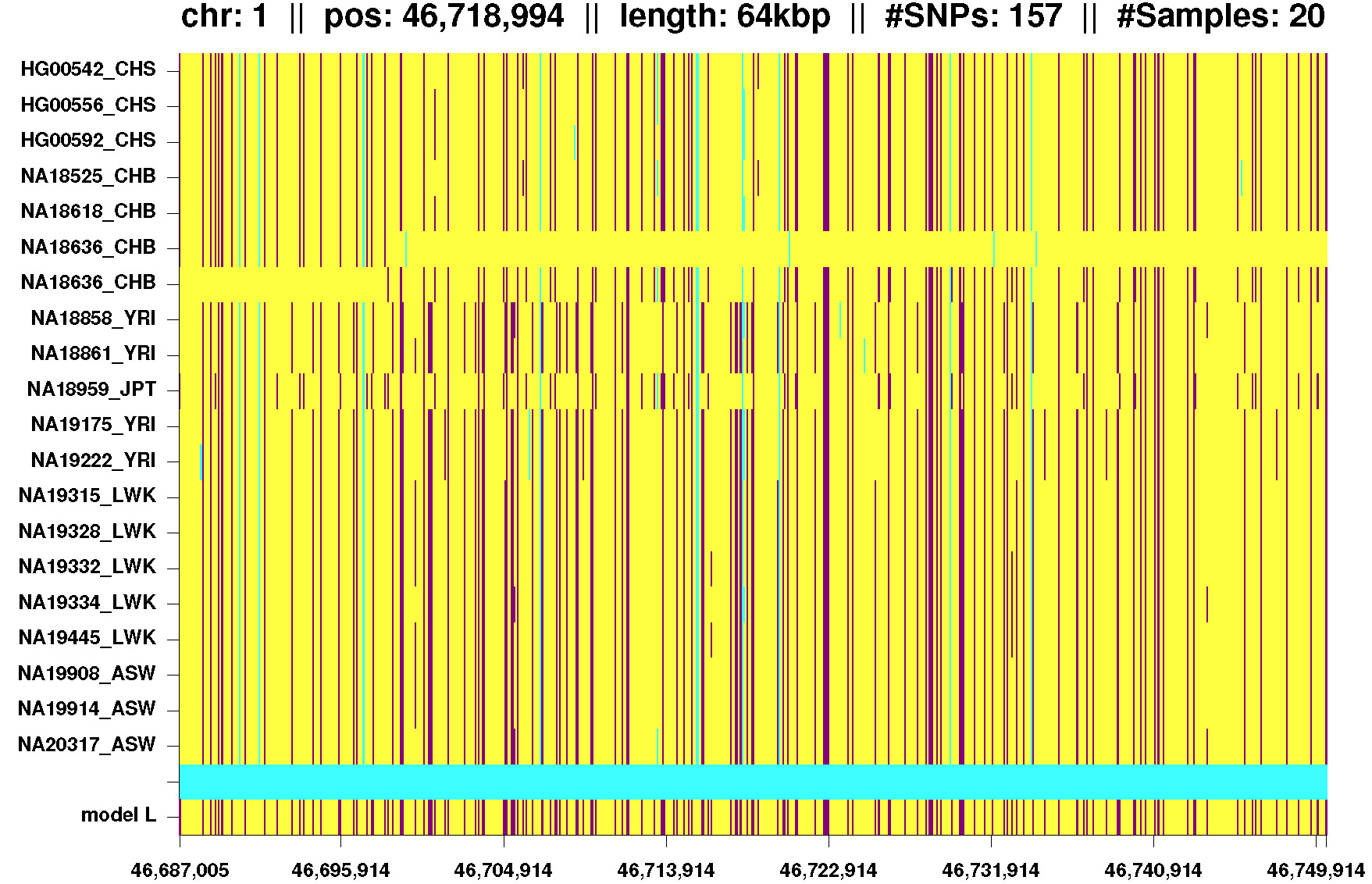 Fig. 5: IBD segment shared by Africans and Asians. Phasing errors at lines 6 and 7 (NA18636).