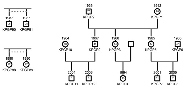 Pedigree charts for the KPGP individuals. Click on thumbnail to view full-size image.