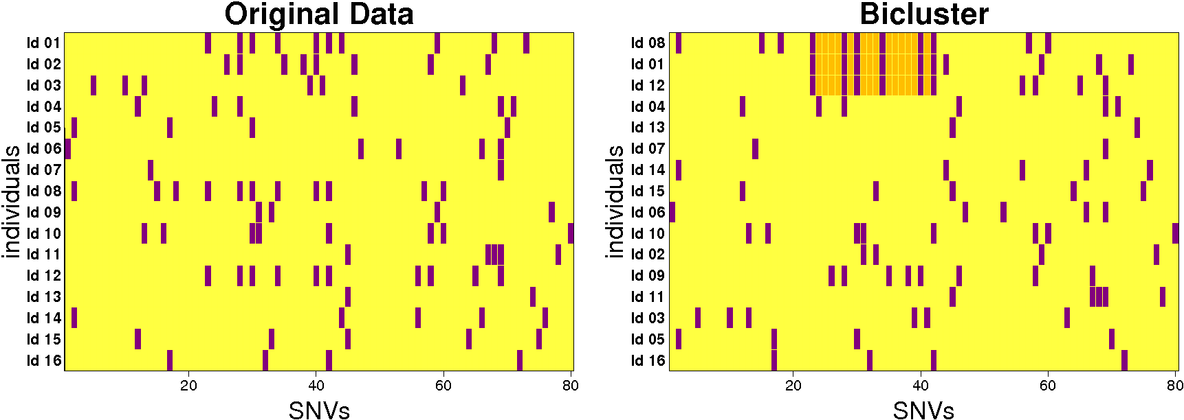 Biclustering of a genotyping matrix. Left: original genotyping data matrix with individuals as row elements and SNVs as column elements. Minor alleles are indicated by violet bars and major alleles by yellow bars for each individual-SNV pair. Right: after sorting the rows, the detected bicluster can be seen in the top three individuals. They contain the same IBD segment which is marked in gold. Biclustering simultaneously clusters rows and columns of a matrix so that row elements (here individuals) are similar to each other on a subset of column elements (here the tagSNVs).