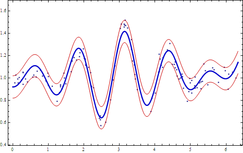 data set 8 and the ε-SVR regression function computed by libSVM using ε=0.1 and the RBF kernel with γ=1; the upper and lower boundaries of the ε-tubes around the regression function are depicted in red