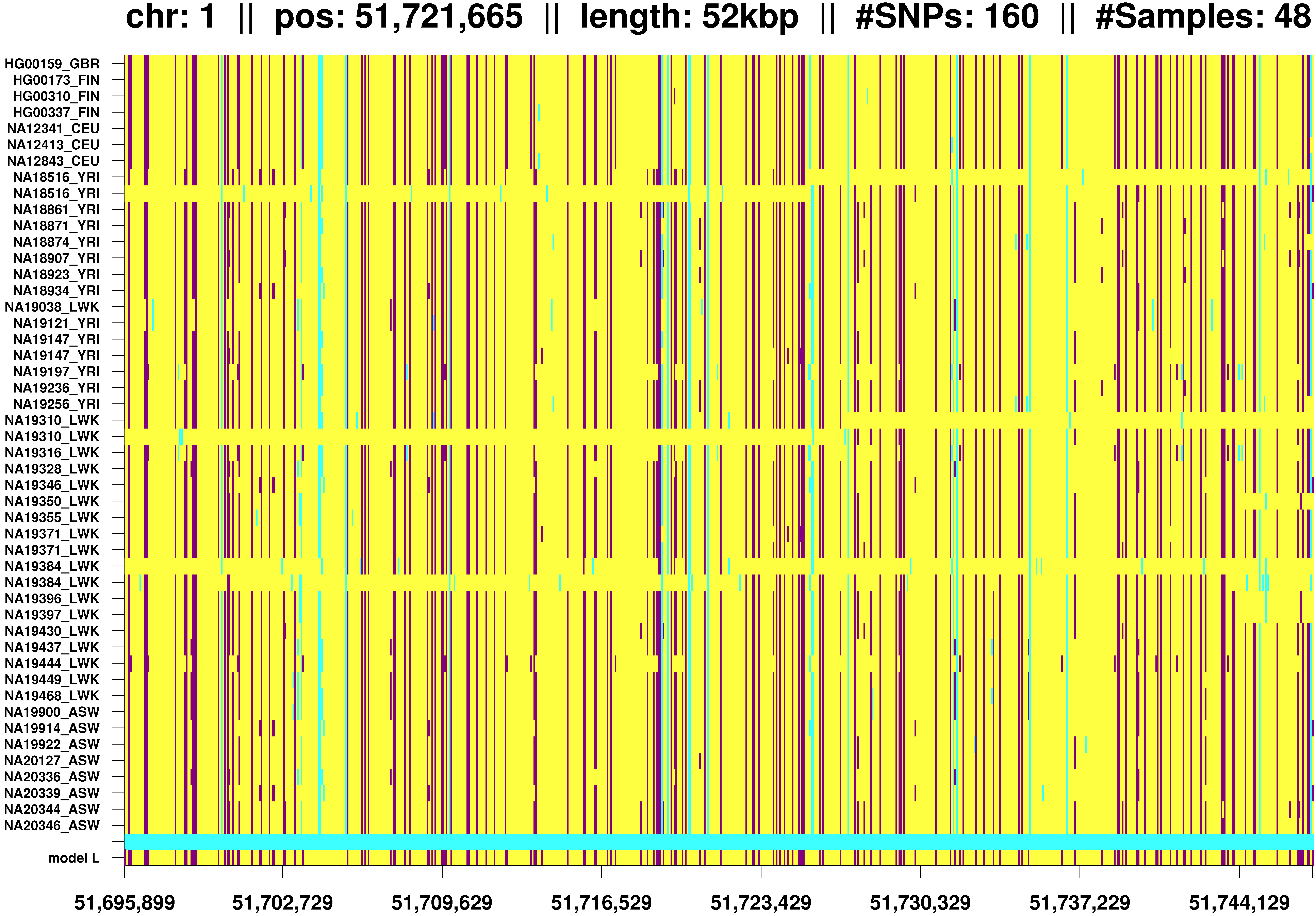 Figure 6 IBD segment shared by Africans and Europeans. Phasing errors at lines 8 and 9 (NA18516), lines 23 and 24 (NA19310), and lines 32 and 33 (NA19384).