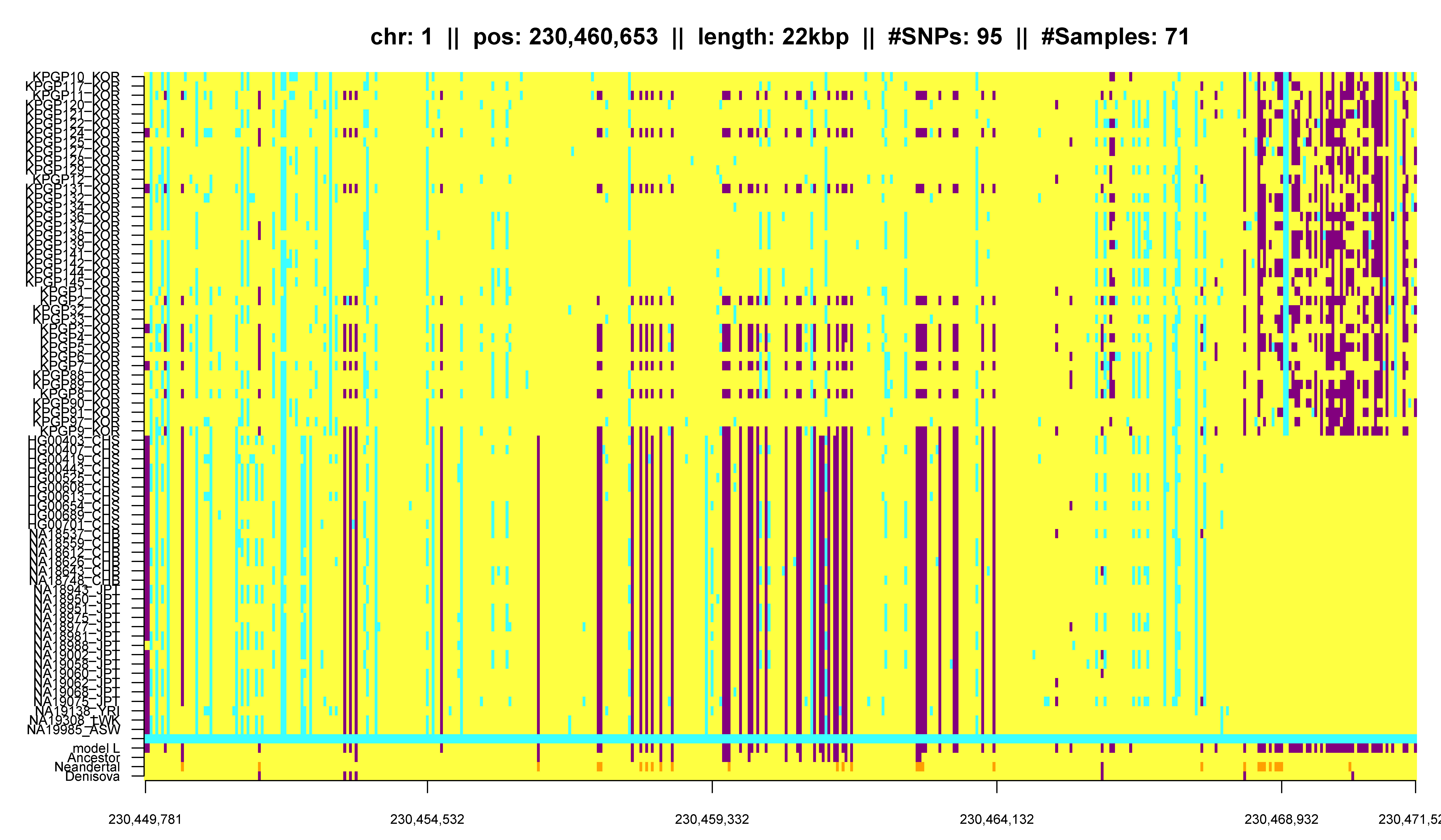 Figure K2: IBD segment with sequencing errors for KPGP individuals at the right hand side. Some Koreans are classified to have this segment because they only agree to other Koreans at the sequencing errors.
