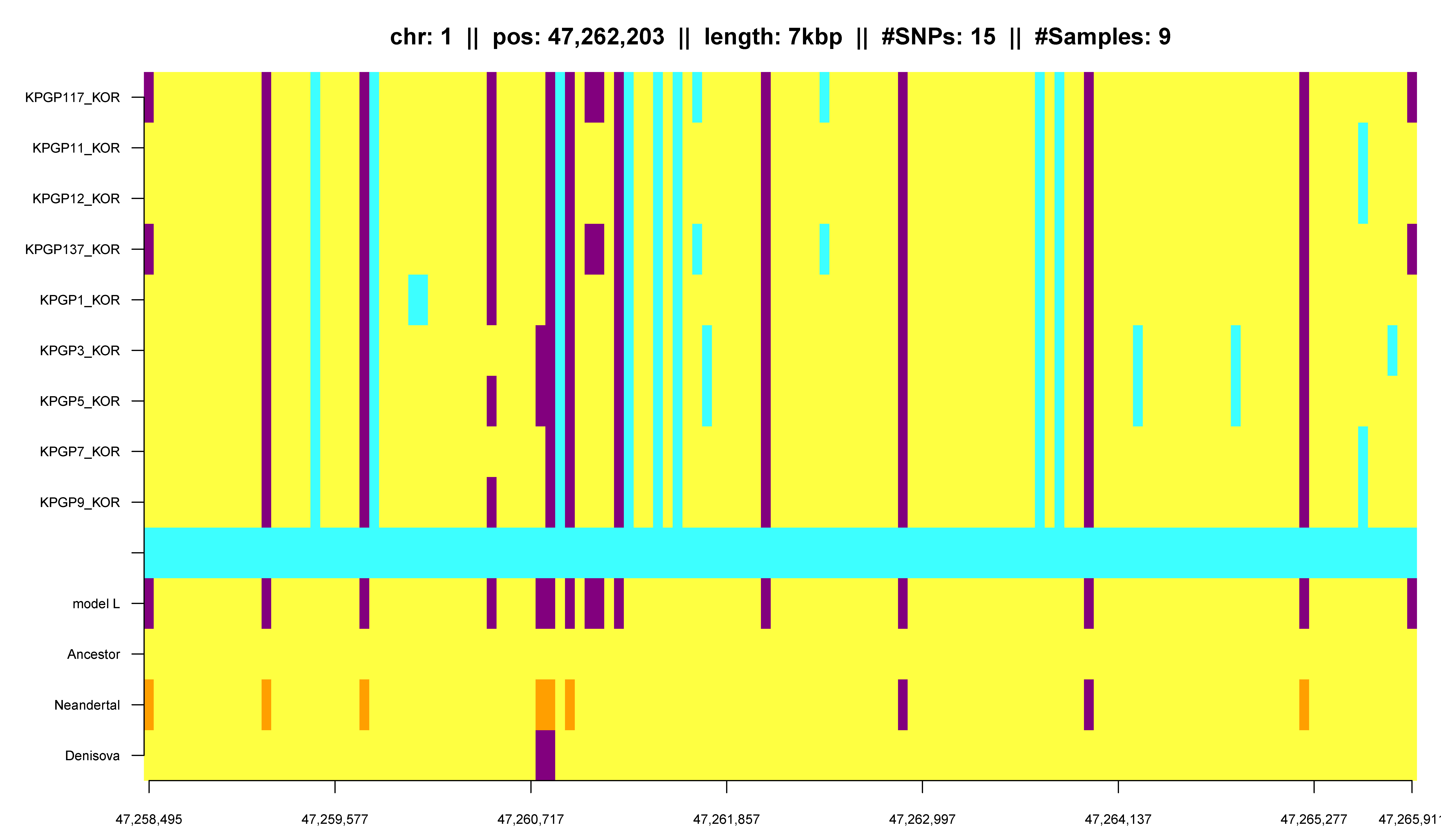 Figure K7: IBD segment which is shared by many members of the Korean family. The IBD segment is descended from KPGP1 to all her children (KPGP3, KPGP5, KPGP9) and some of her grandchildren (KPGP7, KPGP11, KPGP12).